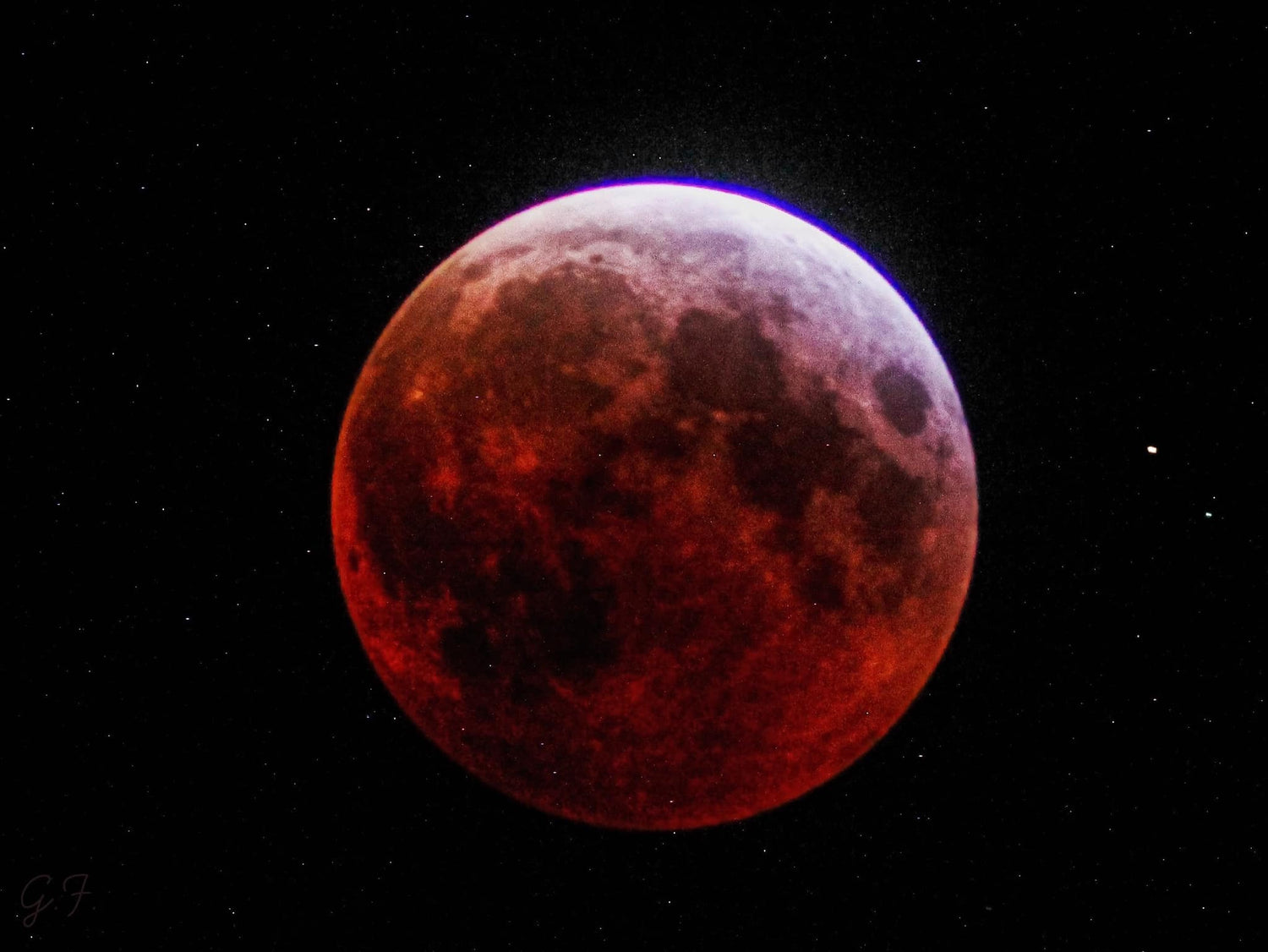 A cosmic ballet of light and shadow, this striking photograph captures the moon in its most dramatic phase. The deep crimson hues and subtle surface details reveal the awe-inspiring beauty of a lunar eclipse, a powerful reminder of the universe's quiet majesty.